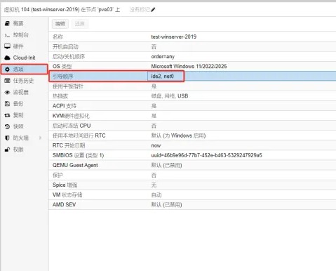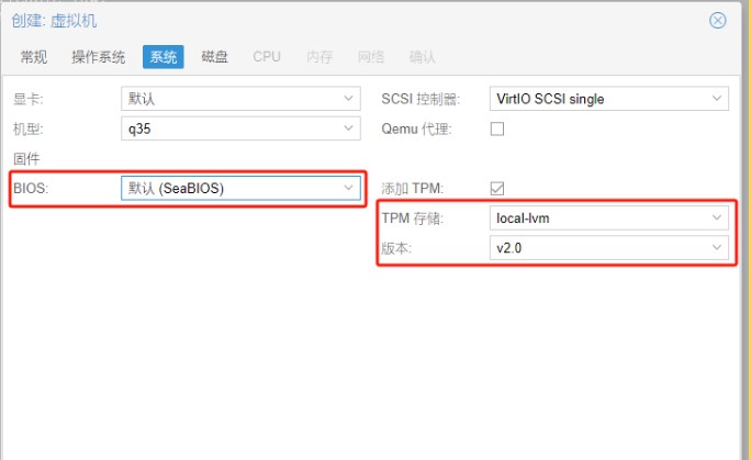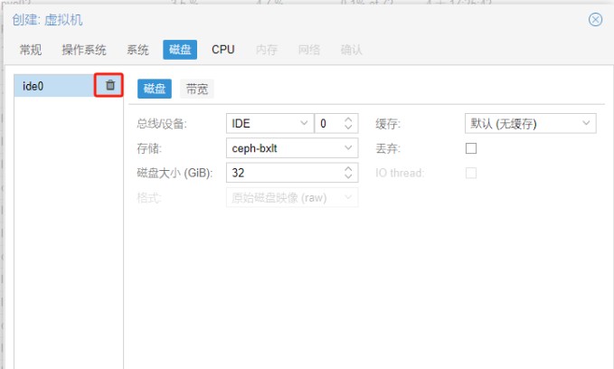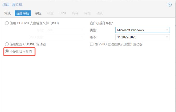 - ④在pve平台中新建空白windows虚拟机(没有光驱和硬盘)