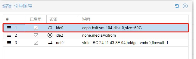 勾选 ide0 设备的 已启用,并将其调整到首位,点击“OK”