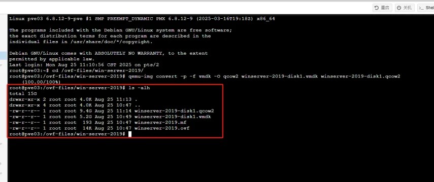 首先实现cd命令定位到vmbx文件所在的目录,然后使用以下命令将vmdk格式转成成pve支持的qcow2格式