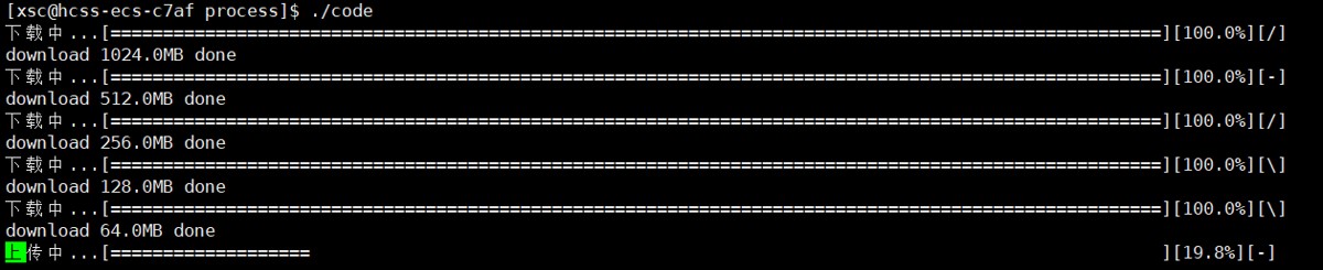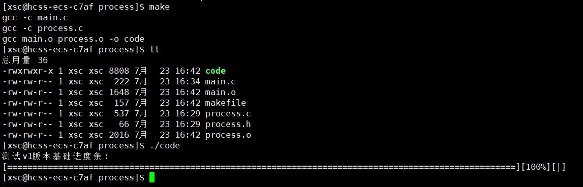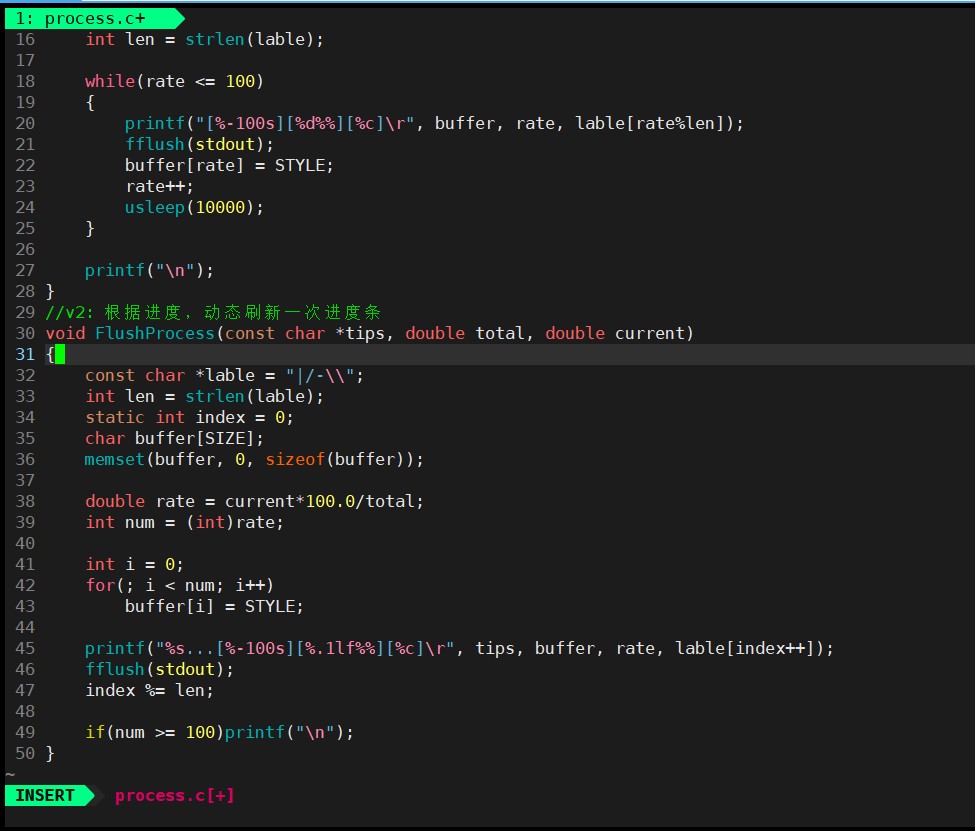 // process.c (v2部分) #include "process.h" #include <string.h> #include <unistd.h> #define SIZE 101 #define STYLE '=' //v2: 根据进度,动态刷新一次进度条 void FlushProcess(const char *tips, double total, double current) { const char *lable = "|/-\\"; int len = strlen(lable); static int index = 0; char buffer[SIZE]; memset(buffer, 0, sizeof(buffer)); double rate = current*100.0/total; int num = (int)rate; int i = 0; for(; i < num; i++) buffer[i] = STYLE; printf("%s...[%-100s][%.1lf%%][%c]\r", tips, buffer, rate, lable[index++]); fflush(stdout); index %= len; if(num >= 100)printf("\n"); }