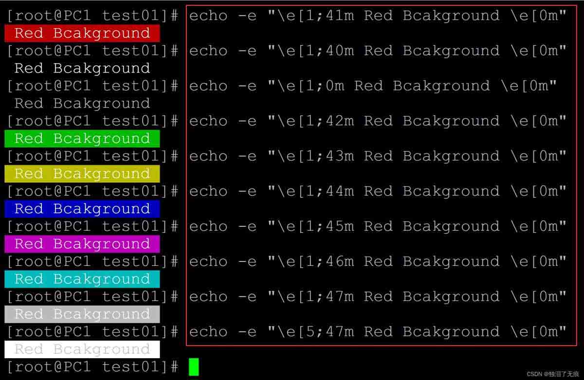 echo -e "e[1;41m Red Bcakground e[0m" ## 41 红色 echo -e "e[1;40m Red Bcakground e[0m" ## 40 黑色 echo -e "e[1;0m Red Bcakground e[0m" ## 0 重置 echo -e "e[1;42m Red Bcakground e[0m" ## 42 绿色 echo -e "e[1;43m Red Bcakground e[0m" ## 43 黄色 echo -e "e[1;44m Red Bcakground e[0m" ## 44 蓝色 echo -e "e[1;45m Red Bcakground e[0m" ## 45 紫色 echo -e "e[1;46m Red Bcakground e[0m" ## 46 天蓝色 echo -e "e[1;47m Red Bcakground e[0m" ## 47 白色 echo -e "e[5;47m Red Bcakground e[0m" ## 5 表示闪烁