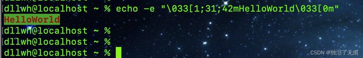 echo -e "\033[1;31;42mHelloWorld\033[0m"