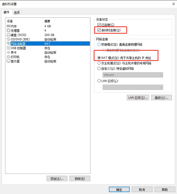 2.在硬件列表中,选中 “Network Adapter” (网络适配器)。在右侧的 “Network connection” (网络连接) 设置中,确保选中了 “NAT (Network Address Translation)”,启用时连接要勾选。