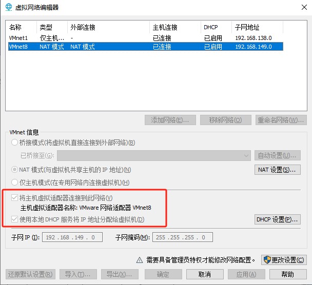 2.在打开 “Virtual Network Editor” (虚拟网络编辑器)。 通常在菜单栏的 Edit (编辑) -> Virtual Network Editor (虚拟网络编辑器)。 VMware 默认状态下的配置是VMnet0(桥接), VMnet1 (仅主机), VMnet8 (NAT) 。至少保证NAT模式下的设置是正确的,必要的选项被勾选。