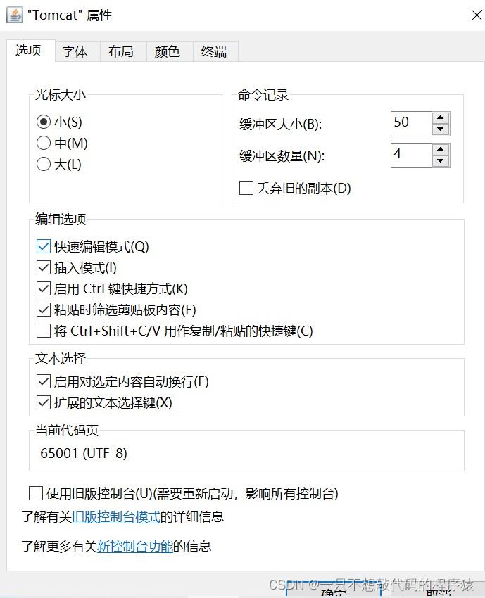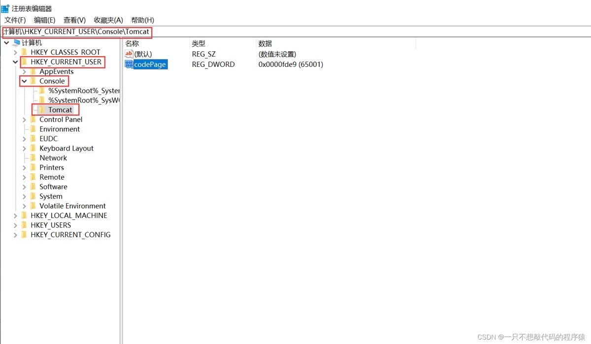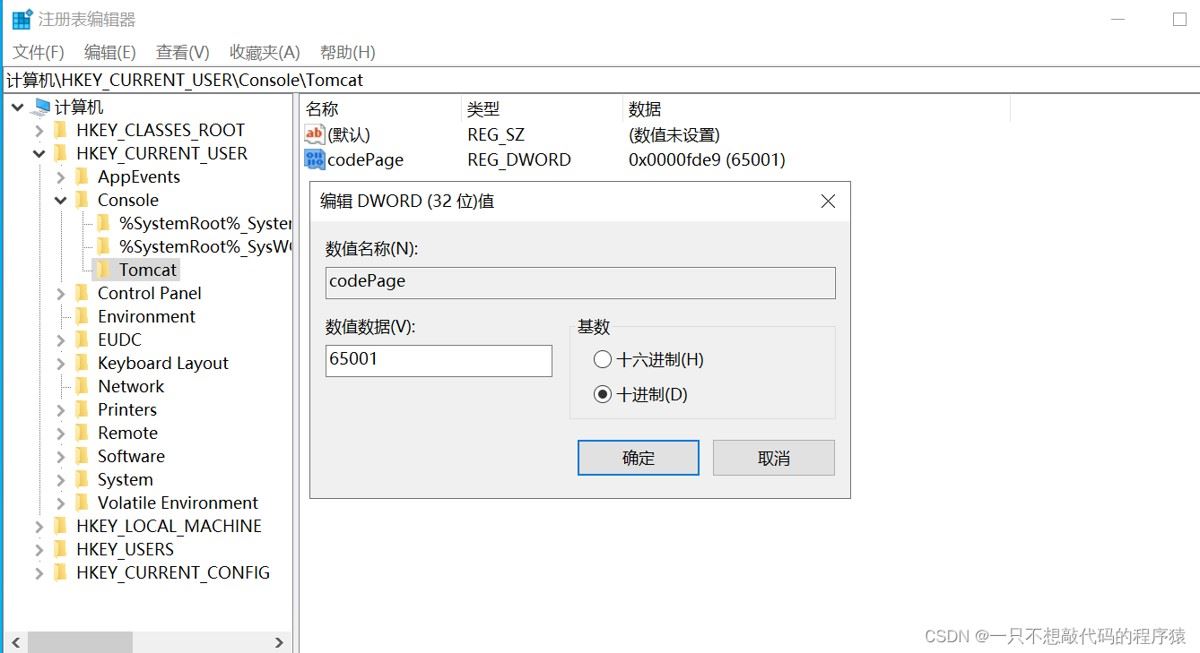 HKEY_CURRENT_USER→Console→Tomcat(一般解压版的Tomcat在console目录下不会有Tomcat这一项,因此需要手动创建),找到CodePage项,没有则创建(注意创建的时候要DWORD32位),设置值为十进制的65001
