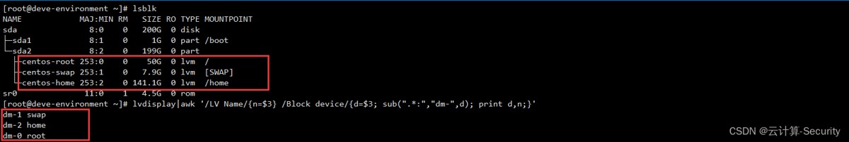 首先看一下这几个目录,dm 是 device mapper(设备映射)的意思,如果分区时使用了 LVM,则一般生成 dm-N 逻辑卷,它类似于普通分区的一个分区 sda0。