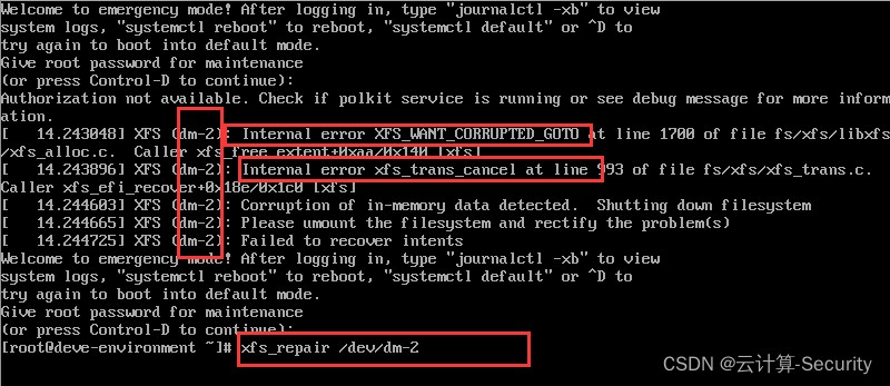 # 解决方案同上 xfs_repair -v -L /dev/dm-2 reboot # 如果报错:xfs_repair: cannot open /dev/dm-2: Device or resource busy ... # 先取消挂载:umount /dev/mapper/centos-home # 再执行 xfs_repair -v -L /dev/dm-2 # 最后重启即可:reboot