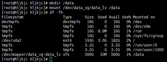 [root@hljkjc hljkjc]# mkdir /data [root@hljkjc hljkjc]# mount /dev/data_vg/data_lv /data [root@hljkjc hljkjc]# df -Th Filesystem Type Size Used Avail Use% Mounted on devtmpfs devtmpfs 16G 0 16G 0% /dev tmpfs tmpfs 16G 0 16G 0% /dev/shm tmpfs tmpfs 16G 8.8M 16G 1% /run tmpfs tmpfs 16G 0 16G 0% /sys/fs/cgroup /dev/vda2 ext4 193G 3.0G 182G 2% / tmpfs tmpfs 3.2G 0 3.2G 0% /run/user/0 tmpfs tmpfs 3.2G 0 3.2G 0% /run/user/1000 /dev/mapper/data_vg-data_lv xfs 500G 33M 500G 1% /data [root@hljkjc hljkjc]#