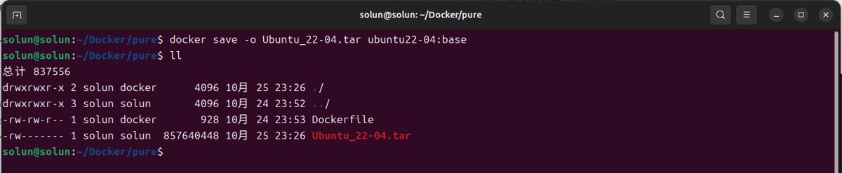 docker save -o <tar_name>.tar <docker_name>:tag # 参数解释 tar_name #要保存的.tar文件名 docker_name #刚才创建的Docker的名字 tag #刚才创建的Docker的tag # for example docker save -o Ubuntu_22-04.tar ubuntu22-04:base
