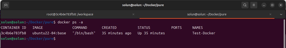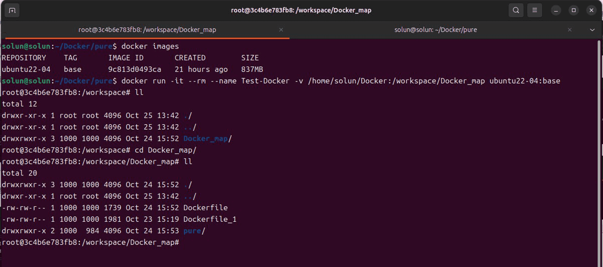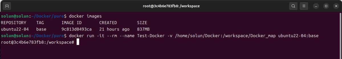 docker run -it --name <容器名称> -v <宿主机绝对路径>:<容器内的绝对路径> <docker名>:<docker tag> # for example docker run -it --name Test-Docker -v /home/solun/Docker:/workspace/Docker_map ubuntu22-04:base