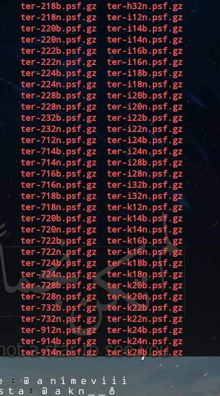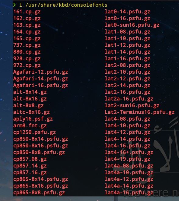 比如笔者的Manjaro位于/usr/share/kbd/consolefonts,CentOS8则位于/usr/lib/kbd/consolefonts,而其他的一些可能位于/lib/usr/consolefonts,其中的文件如下: