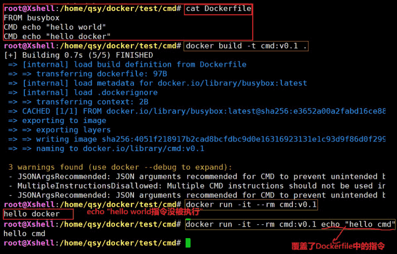 FROM busybox CMD echo "hello world" CMD echo "hello docker"