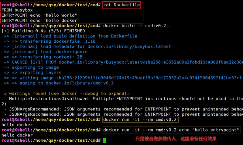 cmd:docker run时指定命令会把cmd命令覆盖。entrypoint:docker run 时添加的指令,会默认作为ENTRYPOINT的参数;若需覆盖ENTRYPOINT,需通过--entrypoint参数指定