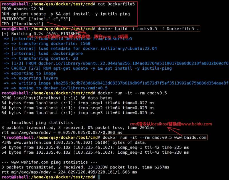 使用exec模式编辑,CMD和ENTRYPOINT配合使用:entrypoint负责可执行程序,cmd负责参数传入。