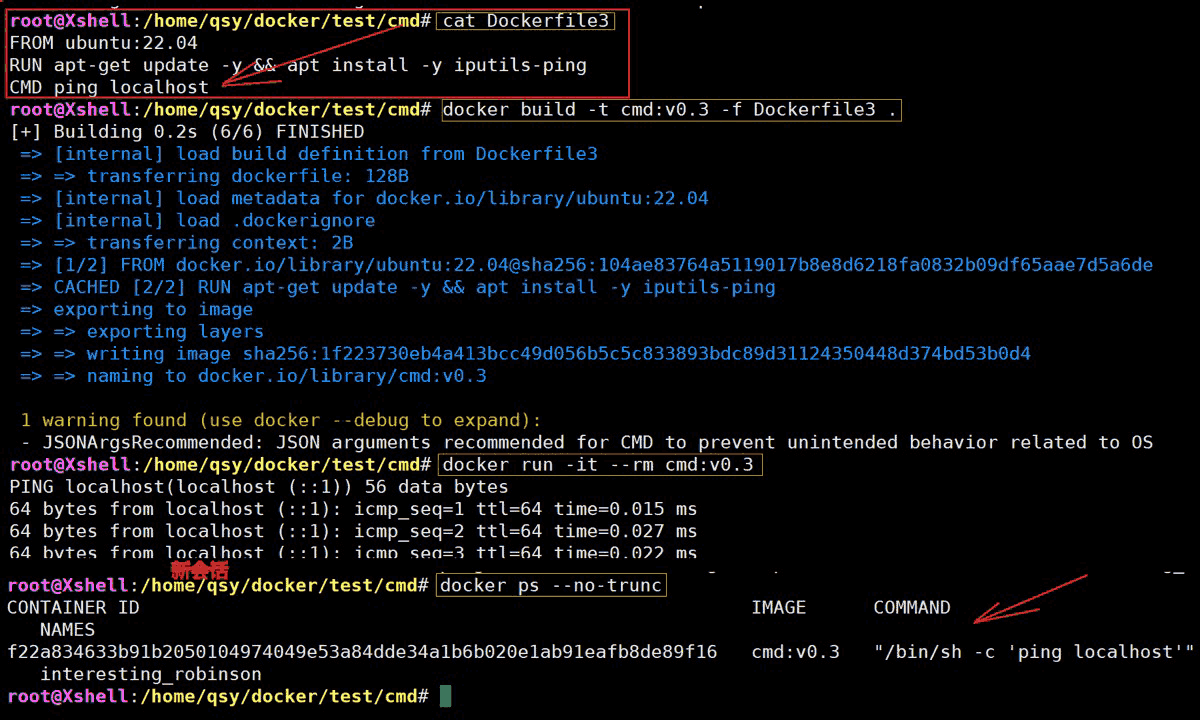 exec模式:把命令放在Json数组shell模式:直接把命令放在后面- 效果上的差异: