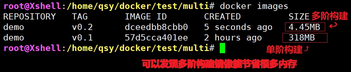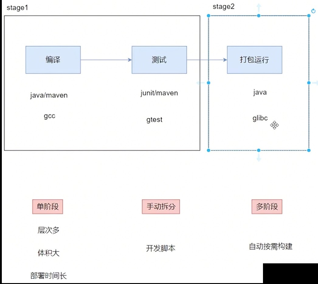 这解决了传统单阶段构建模式(图中的“单阶段”)所带来的问题。