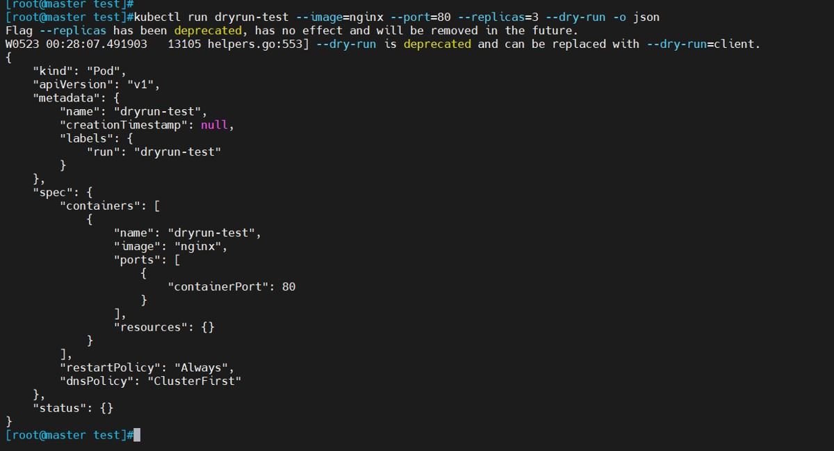 kubectl run dryrun-test --image=nginx --port=80 --replicas=3 --dry-run -o json #查看生成的json资源配置清单