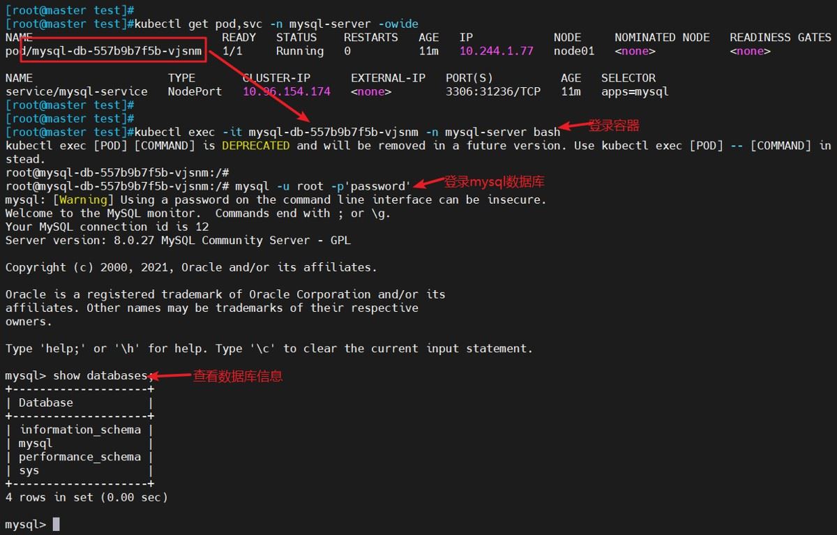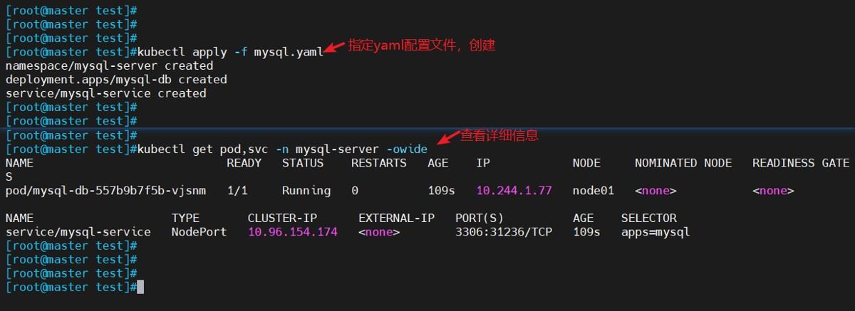 kubectl apply -f mysql.yaml #指定yaml配置文件 kubectl get pod,svc -n mysql-server -owide #查看详细信息