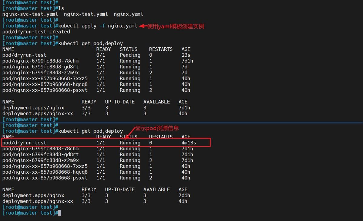 kubectl apply -f nginx.yaml #使用yaml模板创建实例 kubectl get pod,deploy #显示pod资源信息