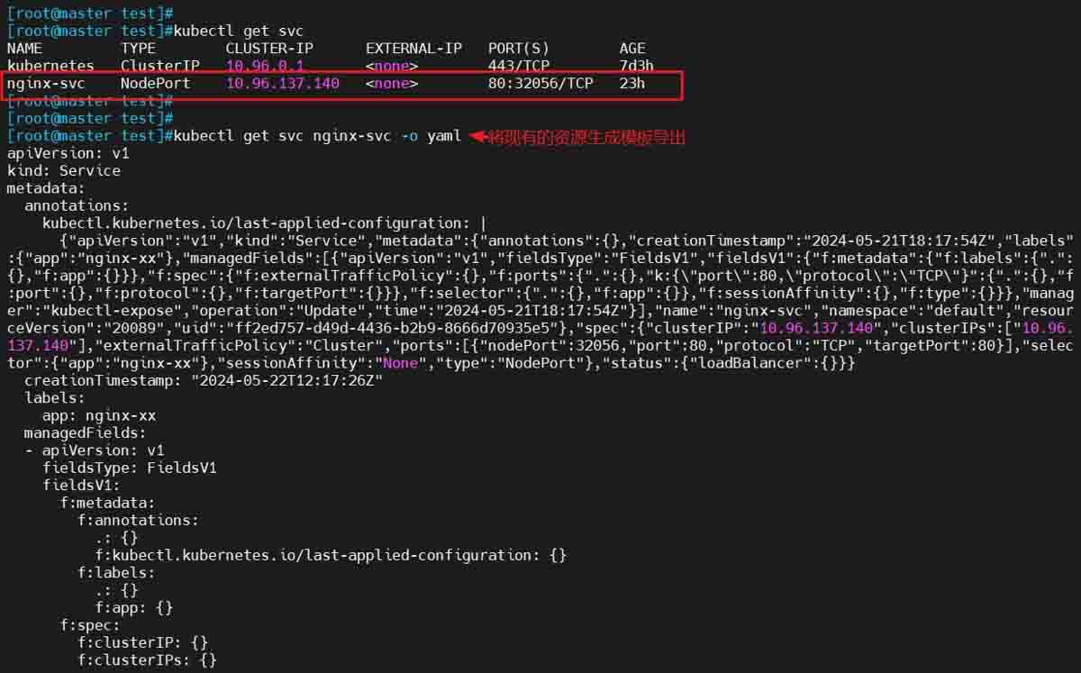kubectl get svc #显示svc信息 kubectl get svc nginx-svc -o yaml #将现有的资源生成模板导出