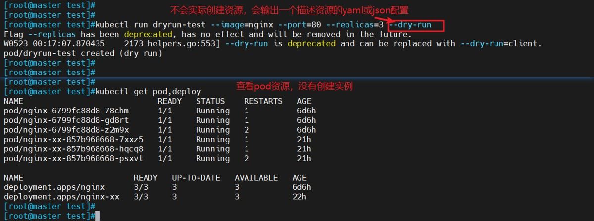 - 使用–dry-run试运行可不触发生成命令,然后通过-o yaml可实现对其yaml资源配置清单的查看