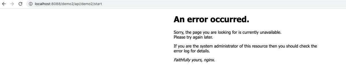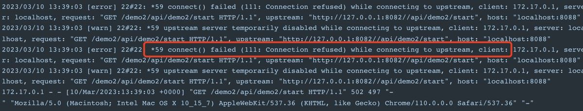 但是如果我想反问demo2呢,前面咱们看到demo2在Nginx里的配置是有些许区别的,来来实验一下看看效果。http://localhost:8088/demo2/api/demo2/start,可以看到容器中的日志是链接refused。至于为啥前面应说了要区分容器和本地的localhost的区别。咱们Nginx是采用的docker容器部署,微服务是本地不熟的。