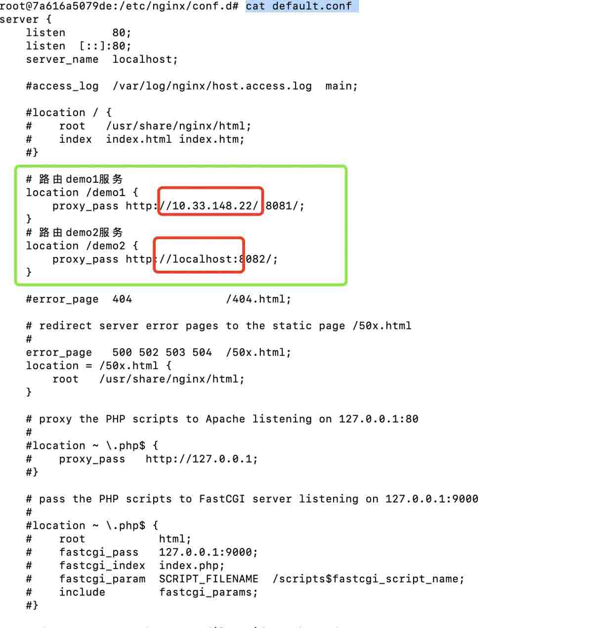 下图就是最新生效的配置文件,我用红色框框起来的是重点,因为容器中访问localhost的时候其实是访问的容器中的localhost,docker容器中的localhost:8081,localhost:8082肯定是没有对应的服务的,后面在实际看一下是对应的现象。
