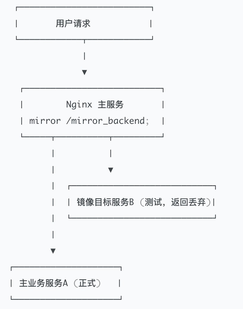 mirror:指定镜像请求目标;mirror_request_body on:复制请求体;internal:防止外部直接访问镜像接口;- 镜像请求是异步执行的,不影响主请求的响应速度。