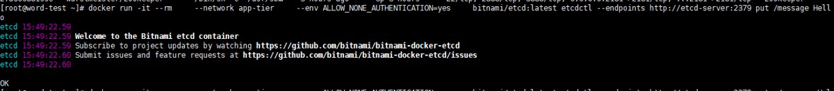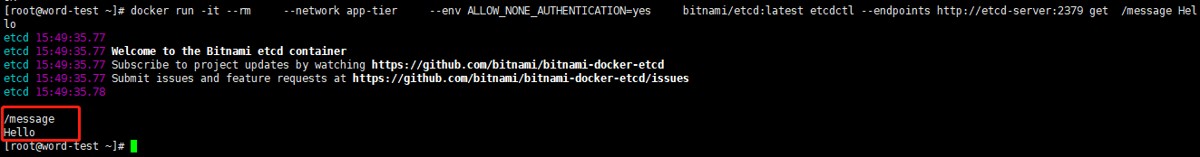 docker run -it --rm --network app-tier --env ALLOW_NONE_AUTHENTICATION=yes bitnami/etcd:latest etcdctl --endpoints http://etcd-server:2379 get /message Hello