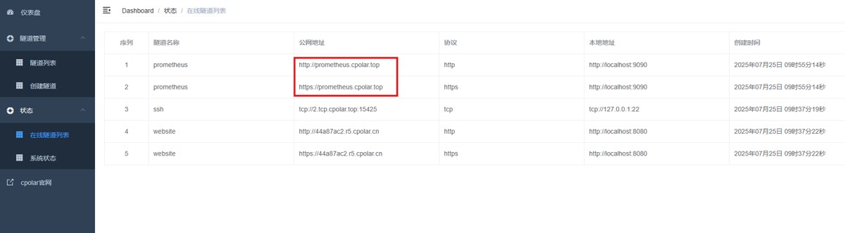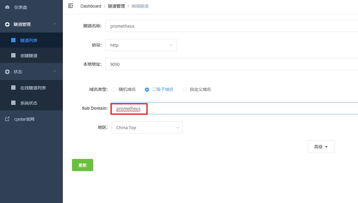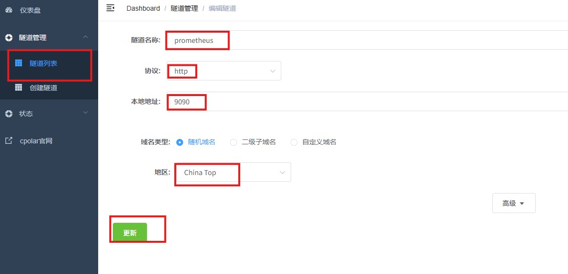 隧道名称:可自定义,本例使用了:prometheus,注意不要与已有的隧道名称重复