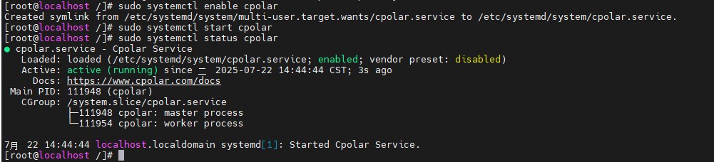 安装完成后,执行下方命令查看cpolar服务状态:(如图所示即为正常启动)