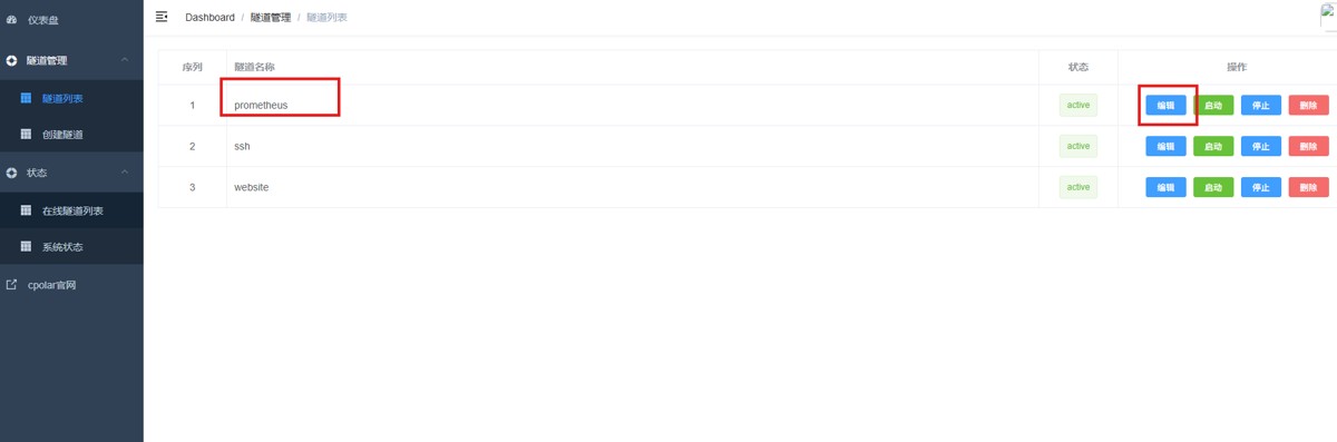 登录cpolar web UI管理界面,点击左侧仪表盘的隧道管理——隧道列表,找到所要配置的隧道prometheus,点击右侧的编辑。