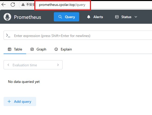 最后,我们使用固定的公网地址在任意设备的浏览器中访问,可以看到成功访问本地部署的prometheus页面,这样一个永久不会变化的二级子域名公网网址即设置好了。