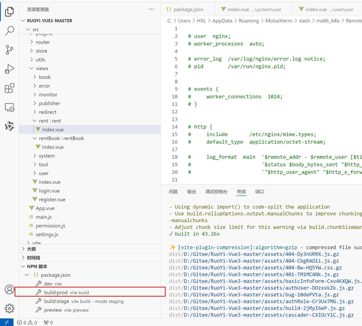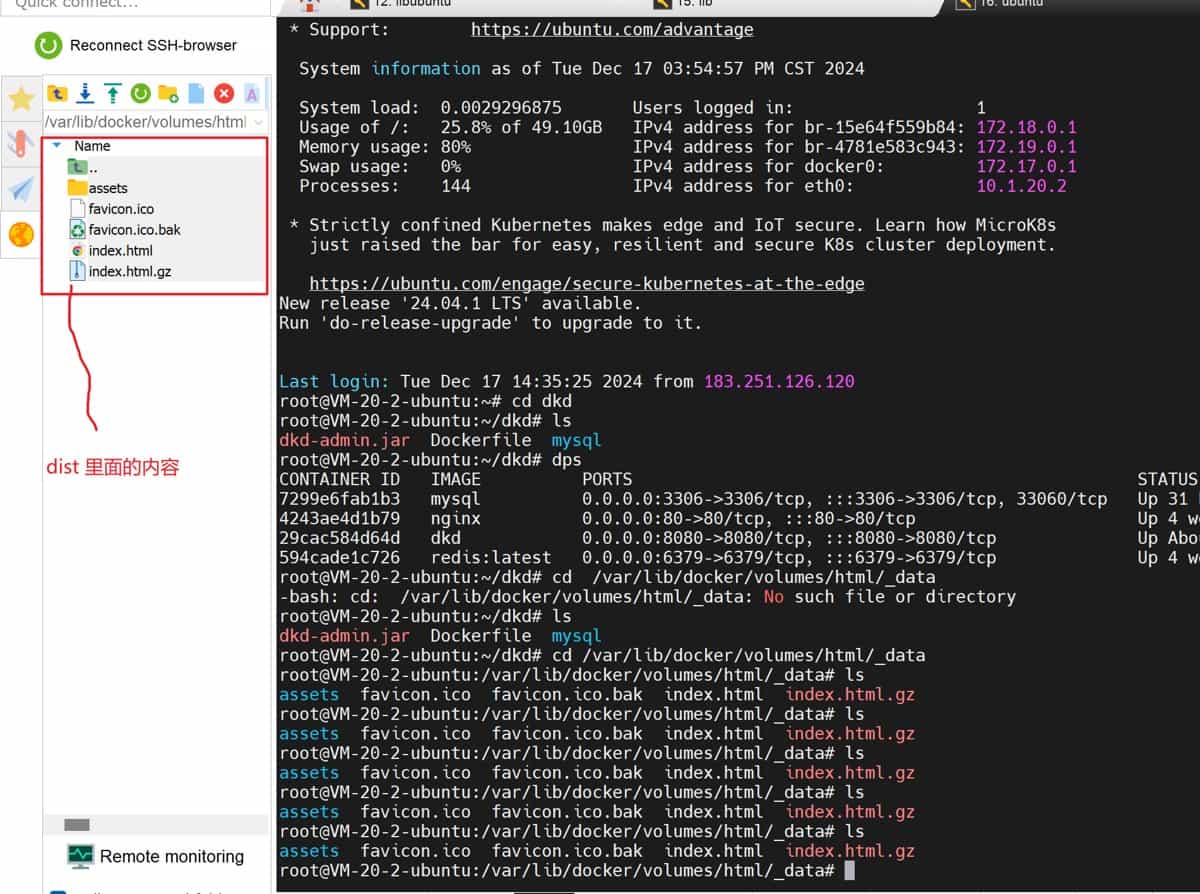 - 打包前端项目,生成 dist 文件(前端项目所在位置)。