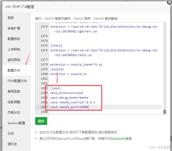 打开宝塔对应 PHP 版本的 php.ini 配置文件,在文件末尾添加 yasd 扩展的加载指令。需要设置 yasd 为远程调试模式,配置调试服务器监听的 IP 地址和端口号(通常使用 19000 端口)。还需要设置相关的调试参数,如日志级别、断点文件路径等。配置完成后,需要在宝塔面板中重载 PHP 配置,或者通过命令行重启 PHP-FPM 服务使配置生效。