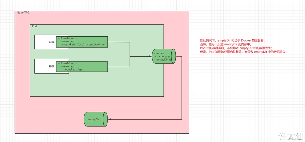 EmptyDir是在Pod被分配到Node时创建的,它的初始内容为空,并且无须指定宿主机上对应的目录文件,因为kubernetes会自动分配一个目录,当Pod销毁时,EmptyDir中的数据也会被永久删除。