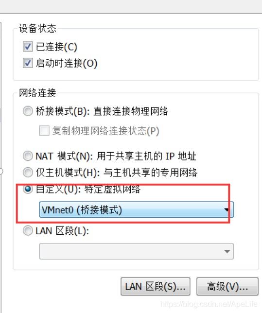 网络连接可以选择桥接模式,其中复制物理网络连接状态选不选都无所谓。也可以在自定义那里选择vmnet0桥接。两种方式都可以,任选一种就好了