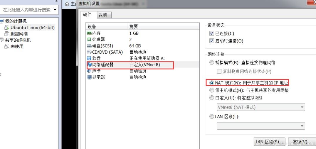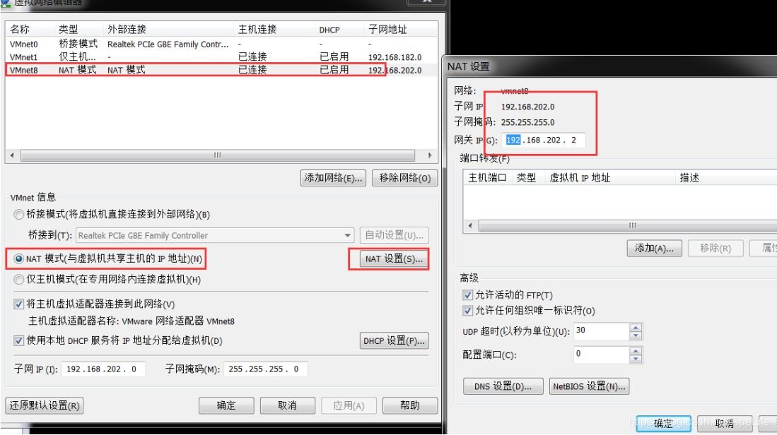 所谓的nat模式,就是虚拟机自己相当于一个小型局域网,这个局域网内部有自己的网关地址,以及dhcp地址池。虚拟机的ip地址为这个局域网中dhcp地址池中的某个ip地址。虚拟机所在的局域网跟物理机是处于两个不同的局域网的。上网的时候将这个虚拟机ip地址nat为物理机的ip地址,也就是说当虚拟机想访问外网时,需要转换为物理机的出口地址。 物理机上的vmnet8是物理机上的一个虚拟网卡,用于nat模式虚拟机上的网卡与物理机相连。