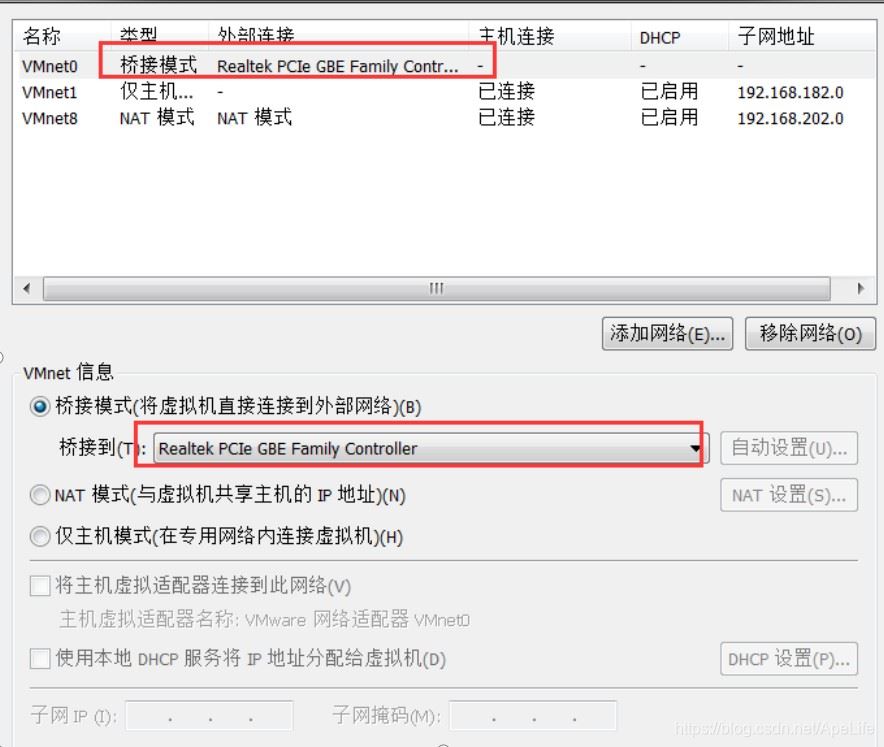 所谓桥接模式,也就是虚拟机与宿主机处于同一个网段, 宿主机与虚拟机是平级关系, 例如两者都处于同一个局域网,具有相同的网关, 此时虚拟机相当于一台真实的设备。桥接模式下物理机上的vmnet0是物理机上的一个虚拟网卡,被windows隐藏了,无法看到, 用于在桥接情况下虚拟机上的网卡与物理机相连。