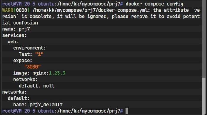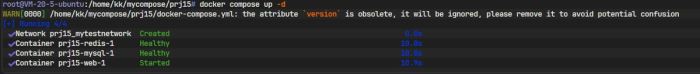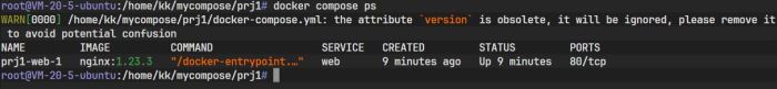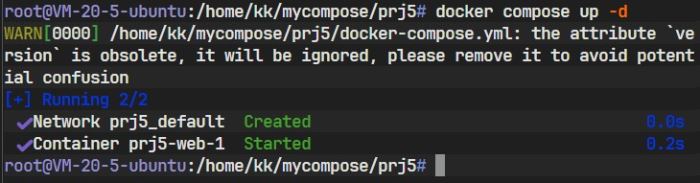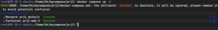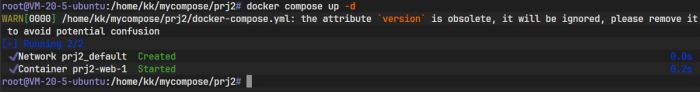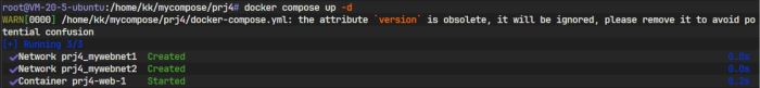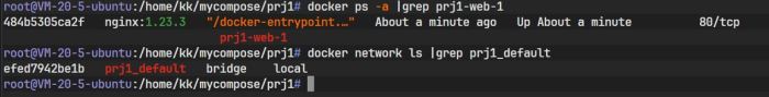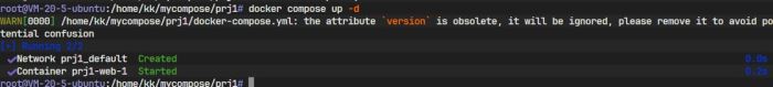 图中信息显示,Docker Compose 自动创建了一个默认网络(prj1_default)并启动了一个容器(prj1-web-1)。