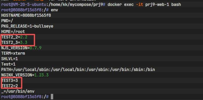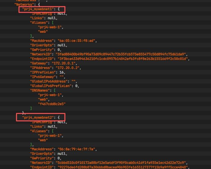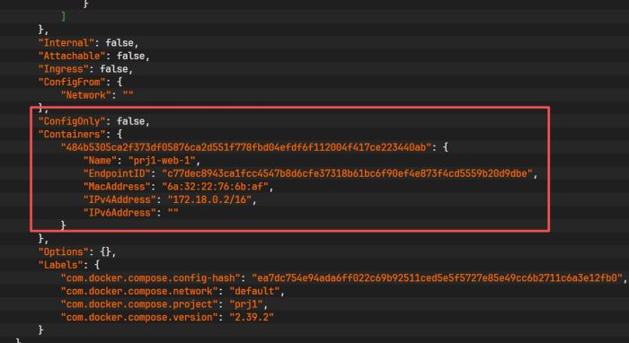 分别启动 prj1 和 prj2 的服务。执行 docker inspect 查看容器详情: