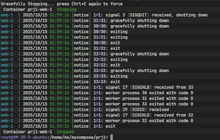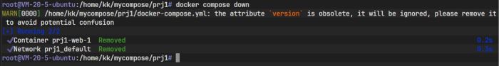 图片显示,不仅容器被停止并删除,连同之前自动生成的项目网络也被一并移除,这体现了 Compose 的整洁管理特性。