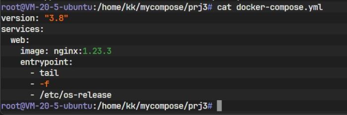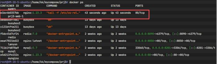 通过 docker inspect prj2-web-1 可以观察到其命令确实变更为我们指定的 tail 命令: