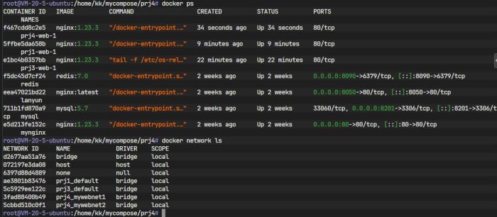 通过 docker ps -a 和 docker network ls 进行查询验证: