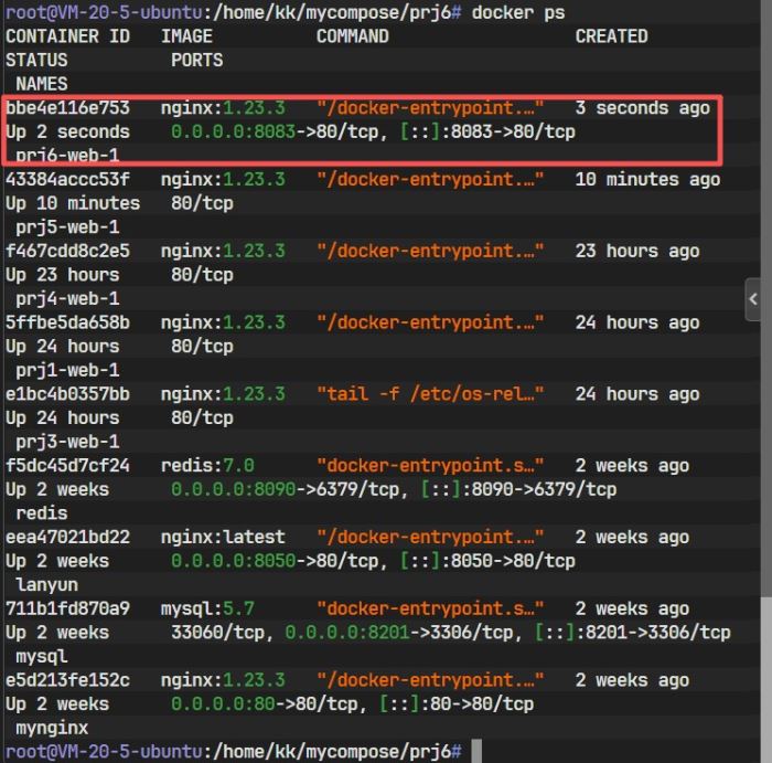 通过 docker compose ps 可以直观查看当前项目下的服务状态:
