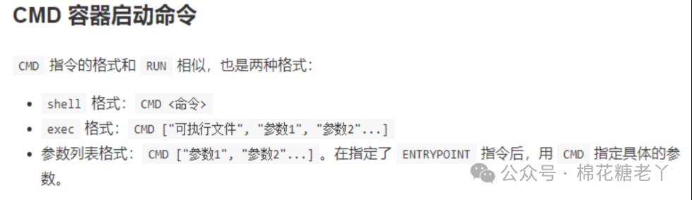 - CMD:指定一个容器启动时要运行的命令