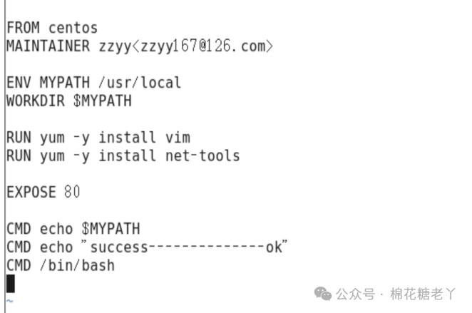 FROM centos MAINTAINER zzyy<zzyy167@126.com> ENV MYPATH /usr/local WORKDIR $MYPATH RUN yum -y install vim RUN yum -y install net-tools EXPOSE 80 CMD echo $MYPATH CMD echo "success--------------ok" CMD /bin/bash