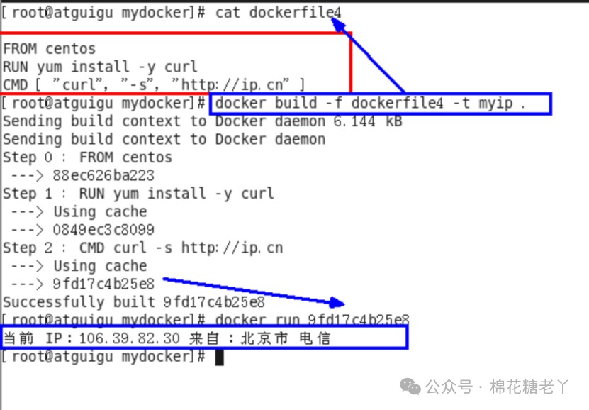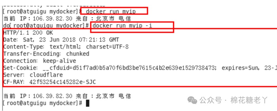 FROM centos RUN yum install -y curl ENTRYPOINT [ "curl", "-s", "http://ip.cn" ]