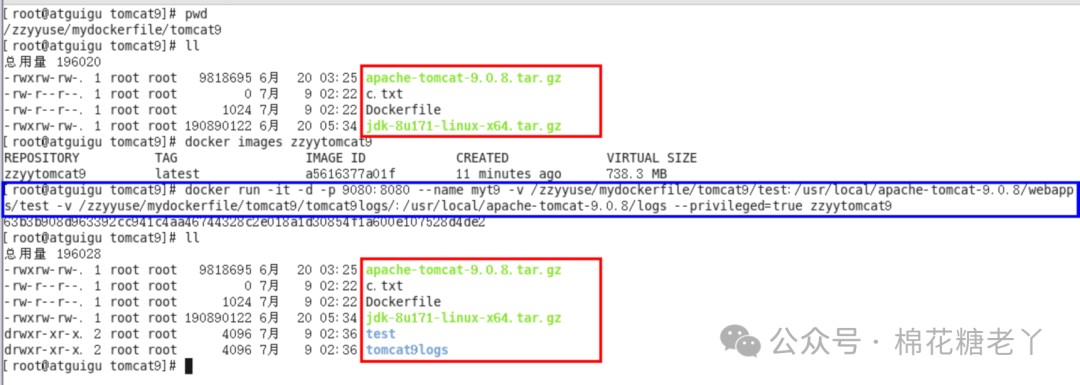 docker run -d -p 9080:8080 --name myt9 -v /zzyyuse/mydockerfile/tomcat9/test:/usr/local/apache-tomcat-9.0.8/webapps/test -v /zzyyuse/mydockerfile/tomcat9/tomcat9logs/:/usr/local/apache-tomcat-9.0.8/logs --privileged=true zzyytomcat9