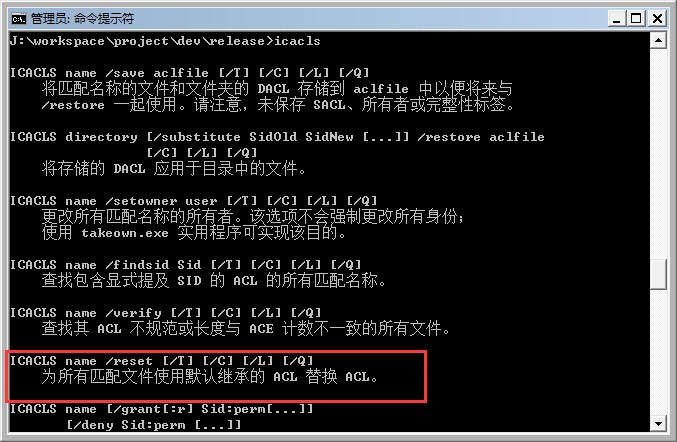 windows下修改文件或文件夹的权限是使用icacls命令,关于使用icals的详细说明参见icacls的命令行帮助。